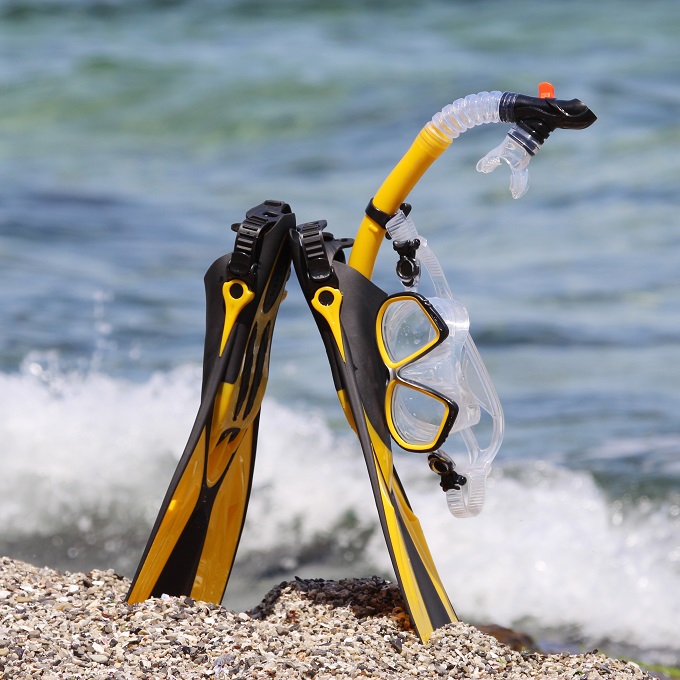 Flippers, mask and snorkel lying on sandy beach. Sea background
